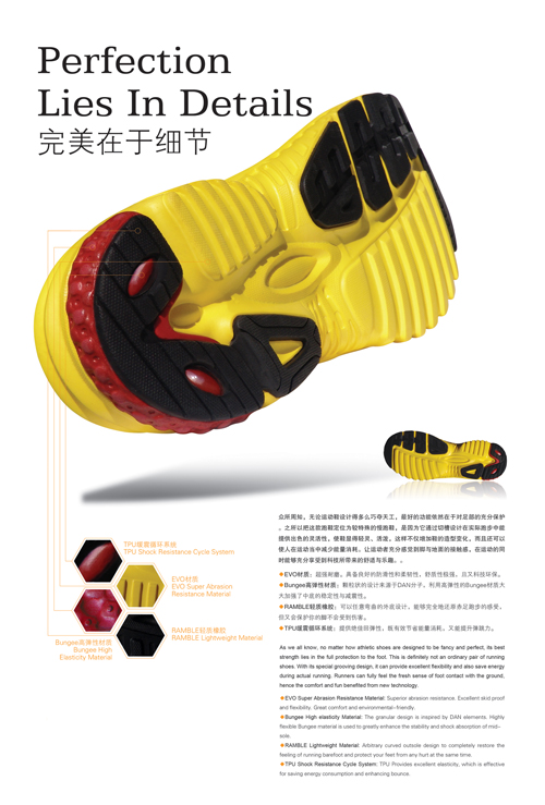 →Bungee高弹性材质:颗粒状的设计来源于DAN分子,利用高弹性的Bungee材质大大加强了中底的稳定性与减震性。