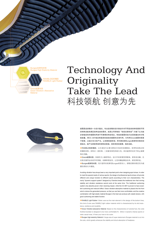 →整体:避震是运动鞋的一大设计重点,专业运动鞋的设计就会针对不同运动的特性提供不同的特殊功能来满足各种运动的需求。成昌公司研制的“动态支撑系统”打破了认为跑步者稳定性和缓震性两者不可兼得的传统观点。传统的缓震系统只在受到撞击时才吸收能量,而CC-697被证明是具有绝佳的缓震和反弹作用。它利用Grace减震材质置于前掌,以减少压力的产生,让双脚倍感舒适;而与脚后跟Bungee高弹性材质的创意结合,能产生柔软而富有弹性的质感,具有很好的缓震、稳定功能。