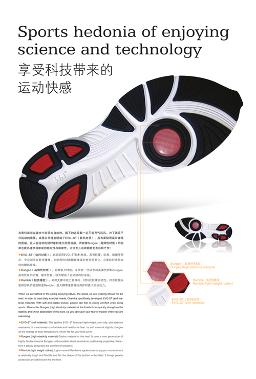 →整体:当我们淋浴在春光中享受大自然时,脚下的这双鞋一定不能死气沉沉。为了满足平日运动的需要,成昌公司特别研制了EVO-ST(软料材质),具有柔软而富有弹性的质感,让人在运动的同时感到强大的舒适感,而前掌Bungee(高弹性材质)的应用也能迅速加强中底的稳定性与减震性,让你怎么运动都能免去后顾之忧!